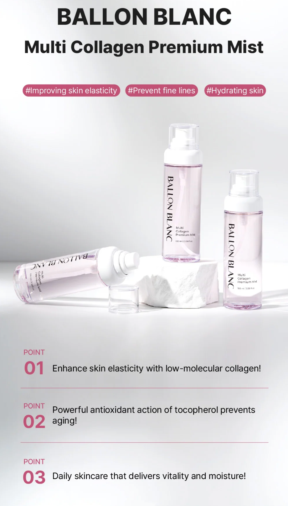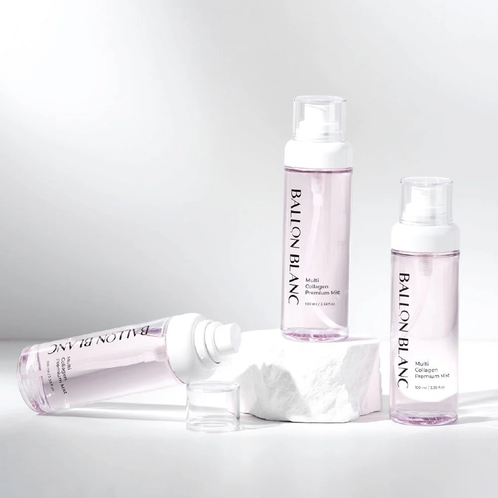 Give your skin the boost it deserves with Ballon Blanc’s Multi Collagen Premium Mist—an all-in-one solution for dry, tired, or aging skin. This lightweight facial mist is formulated with low-molecular-weight collagen to deeply hydrate and visibly plump the skin, helping to restore firmness and elasticity. Tocopherol, a potent antioxidant, helps fight signs of aging while strengthening the skin barrier.