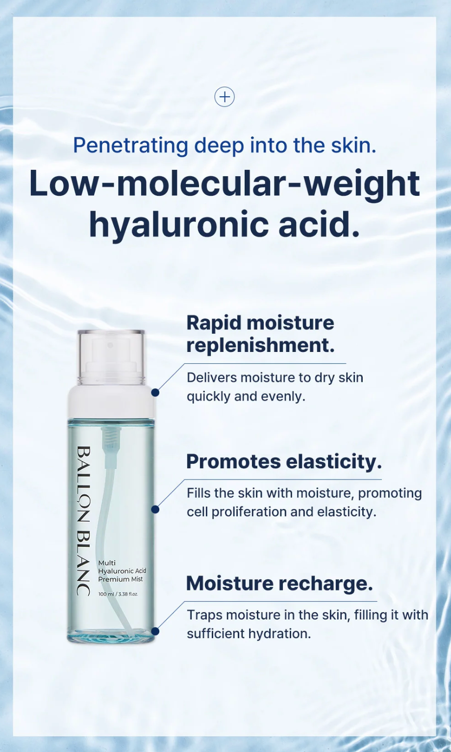 A lightweight, ultra-hydrating facial mist designed to instantly replenish dry skin and deliver long-lasting moisture. Powered by low-molecular-weight hyaluronic acid and barrier-supporting ingredients, this micro-spray nozzle creates an even, weightless layer that won’t disturb makeup. Vegan & EWG Certified.